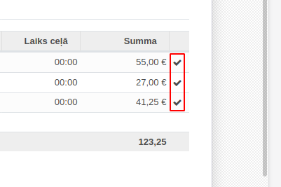 Pēc laika lapas apstiprināšanas automātiski apstiprinātas tiks arī laika lapu rindas un pie tām parādīsies ķeksīšu atzīmes: