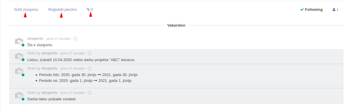 Šajā sadaļā tiks reģistrētas arī ierakstā veiktās izmaiņas un tā paredzēta arī pielikumu pievienošanai. To var izdarīt, klikšķinot uz saspraudes ikonas, vai pievienojot to ziņojumam vai iekšējai piezīmei. Lai reģistrētu ziņojumu, nepieciešams klikšķināt uz opcijas Reģistrēt piezīmi (paziņojums ir tikai iekšējs, par to netiek izziņots ieraksta “sekotājiem”, ja vien tie nav “ietagoti”, rakstot “@” simbolu un izvēloties lietotāju) vai arī uz opcijas Sūtīt ziņojumu (šajā gadījumā par ziņu tiks paziņots ieraksta “sekotājiem”, nosūtot ziņu portālā, kā arī e-pastā, ja lietotājam tāds būs iestatīts).