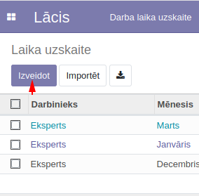 Šajā sistēmas sadaļā lietotājiem paredzēts reģistrēt patērēto darba laiku mēneša ietvaros. Lai izveidotu jaunu laika lapu, saraksta skatā nepieciešams klikšķināt uz pogas “Izveidot” un tiks atvērts jauns laika lapas ieraksts.