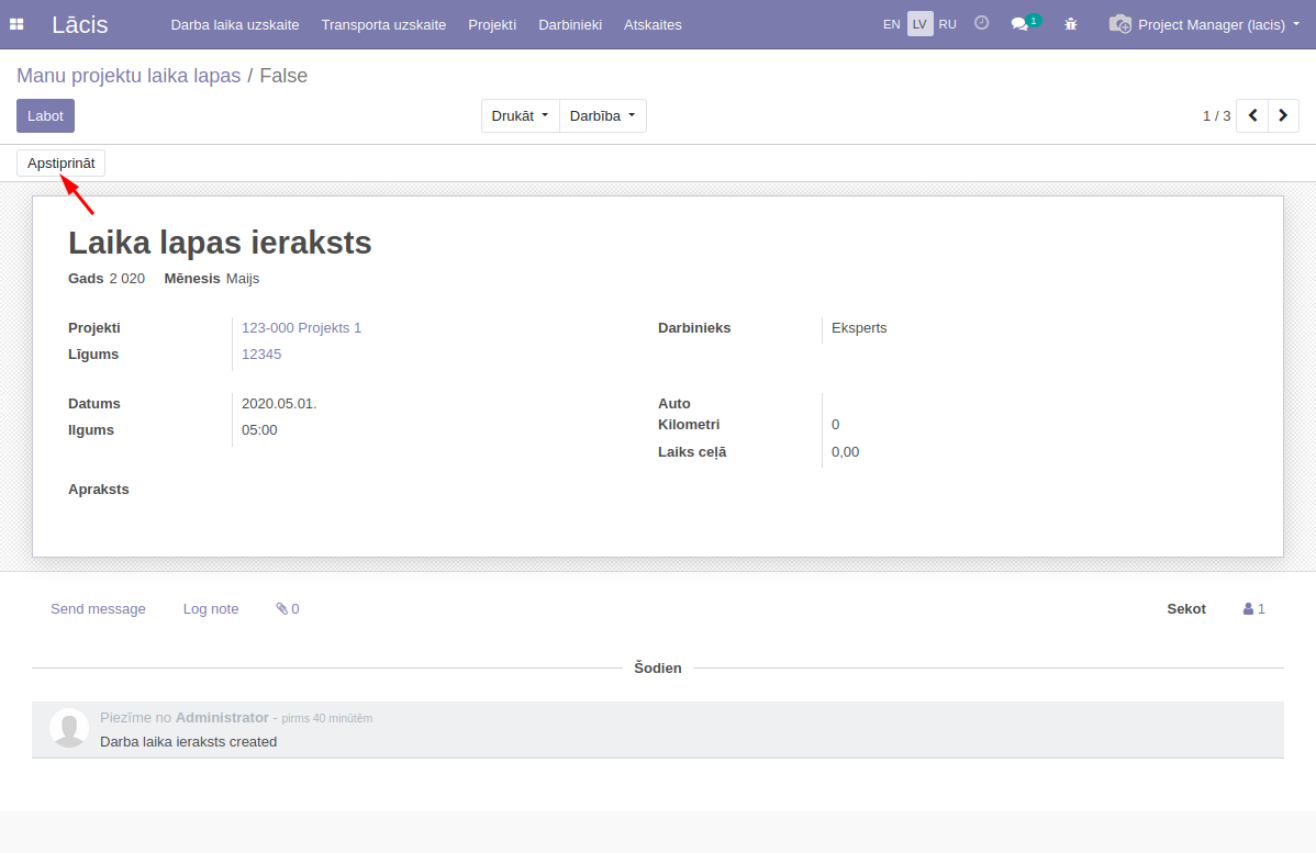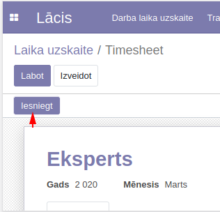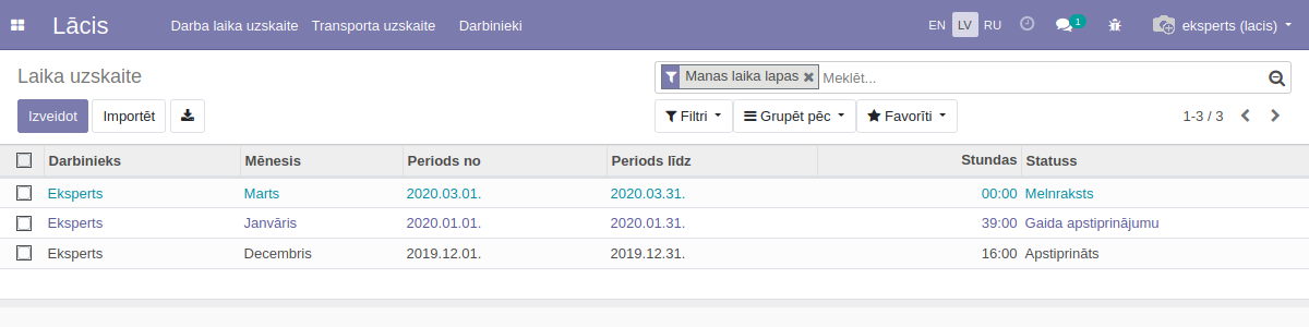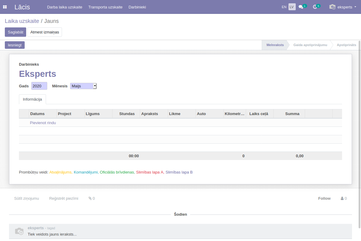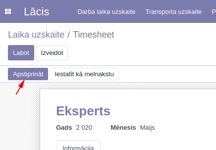 Lietotājs var izveidot laika lapas melnraksta stadijā, kā arī iesniegt tās apstiprināšanai, taču laika lapas apstiprina uzņēmuma vadība.