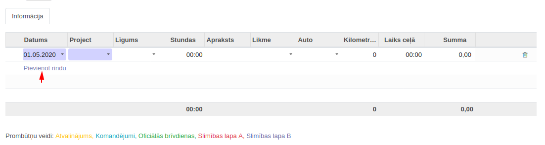 Jauni laika lapu rindu ieraksti tiek pievienoti, laika lapas formas skata “Informācija” sadaļā, klikšķinot uz iespējas “Pievienot rindu”