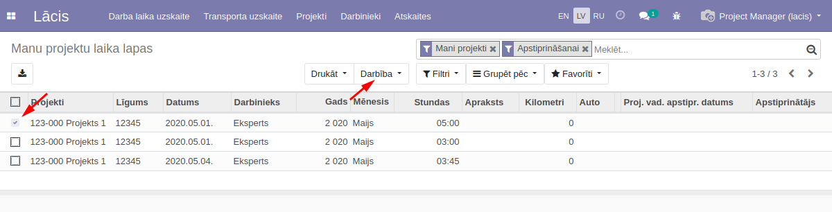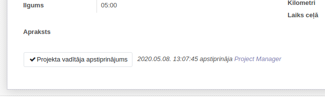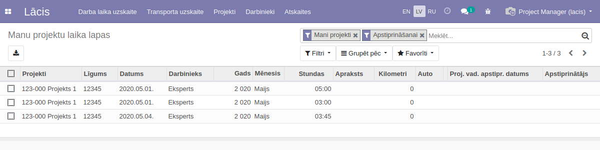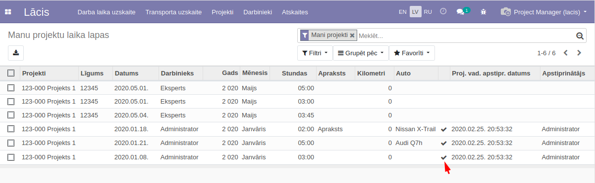 Pēc noklusējuma šajā sarakstā projektu vadītājiem tiek rādīti tikai neapstiprinātie laika lapu ieraksti, kas attiecas uz projektiem, kas ir šo lietotāju pārvaldībā. Tas dod iespēju projektu vadītājam ērti redzēt laika lapu ierakstus, kam nepieciešama apstiprināšana. Jāņem vērā, ka gadījumā, ja pati laika lapa jau ir tikusi apstiprināta, pie laika lapas ieraksta arī autromātiski parādīsies apstiprinājuma pazīme. Pēc noklusētā filtra “Apstiprināšanai” izņemšanas, lietotājs var redzēt arī pilno sarakstu - gan ar apstiprinātajām, gan neapstiprinātajām laika lapām.