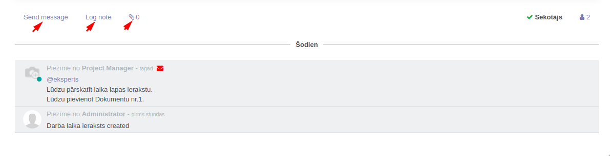 Arī pie laika lapas ieraksta pastāv iespēja pievienot ziņojumus saziņas sadaļā. Piemēram, ja projektu vadītājam rodas jautājumi vai ir piezīmes par laika lapas ierakstu.