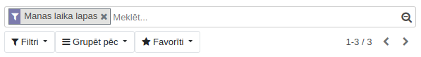 Ierastus var filtrēt, gan ierakstot nepieciešamo frāzi teksta lodziņā un izvēloties kādu no laukiem, kuros frāzi meklēt, gan klikšķinot uz opcijas “Filtri” un “Pievienot pielāgotu filtru”. Ierakstus var grupēt, klikšķinot uz opcijas “Grupēt pēc” un izvēloties nepieciešamo lauku. Pēc filtru izveides, tos var saglabāt favorītos, klikšķinot uz iespējas “Favorīti” un izvēloties opciju “Saglabāt pašreizējo atlasi”. Tādējādi iespējams iestatīt arī noklusējuma filtrus. Administratoriem un grupas Uzņēmuma vadība lietotājiem, pieejamas visu lietotāju veidotās laika lapas, no meklēšanas skata izņemot filtru Manas laika lapas.