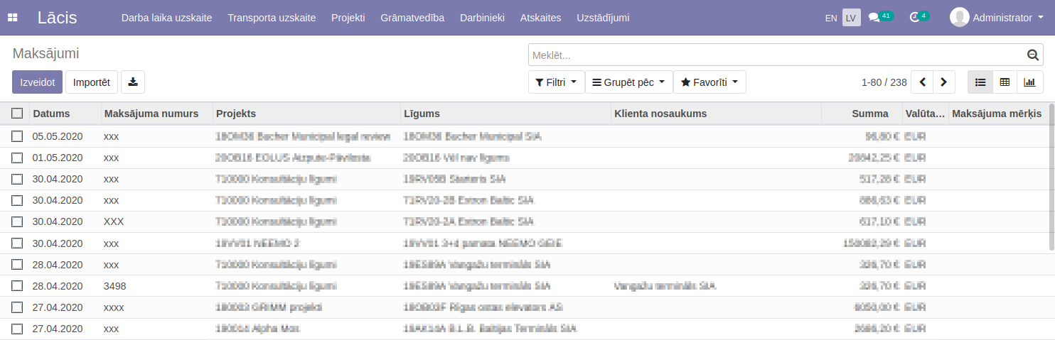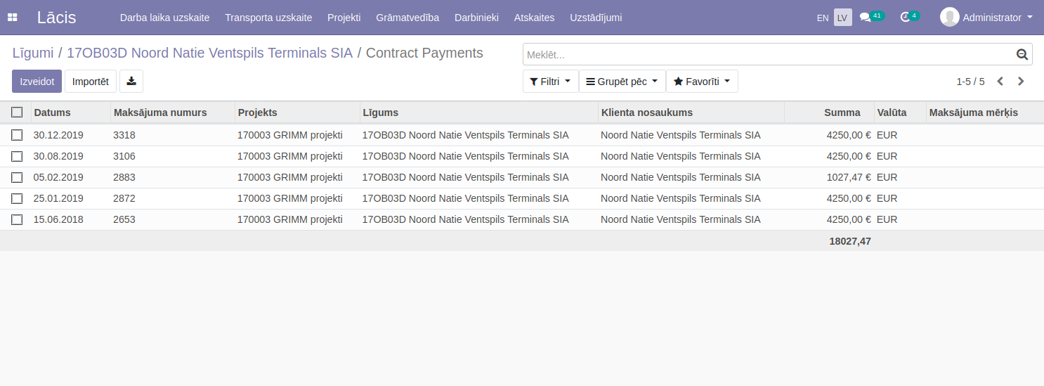 Maksājumu sadaļā pievienotie ieraksti pēc tam tiek summēti pie katra līguma un katra projekta, sadaļā “Maksājumi”: