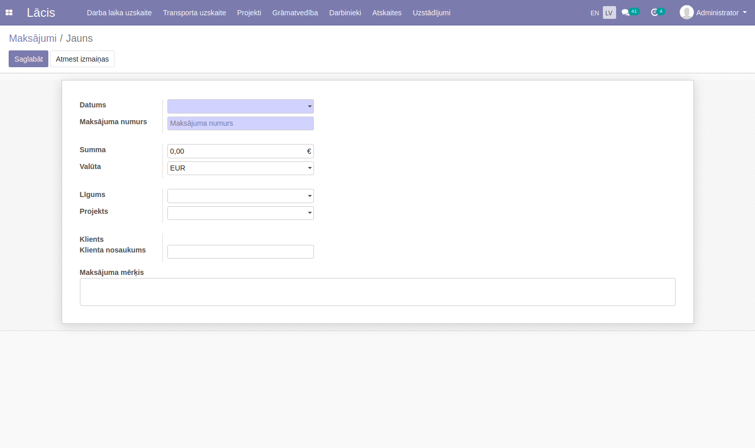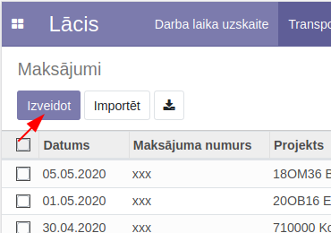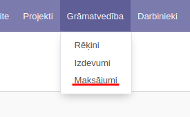 Sadaļa Maksājumi ir pieejama tikai lietotājiem, kas ir grupā Uzņēmuma vadība vai sistēmas administratoriem. Šī sadaļa pieejama izvēlnē Lācis > Grāmatvedība > Maksājumi.