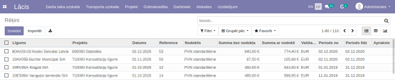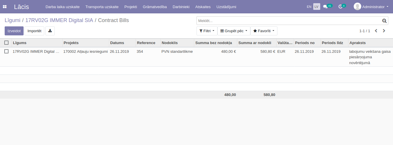 Rēķinu sadaļā pievienotie ieraksti pēc tam tiek summēti pie katra līguma un katra projekta, sadaļā “Rēķini”: