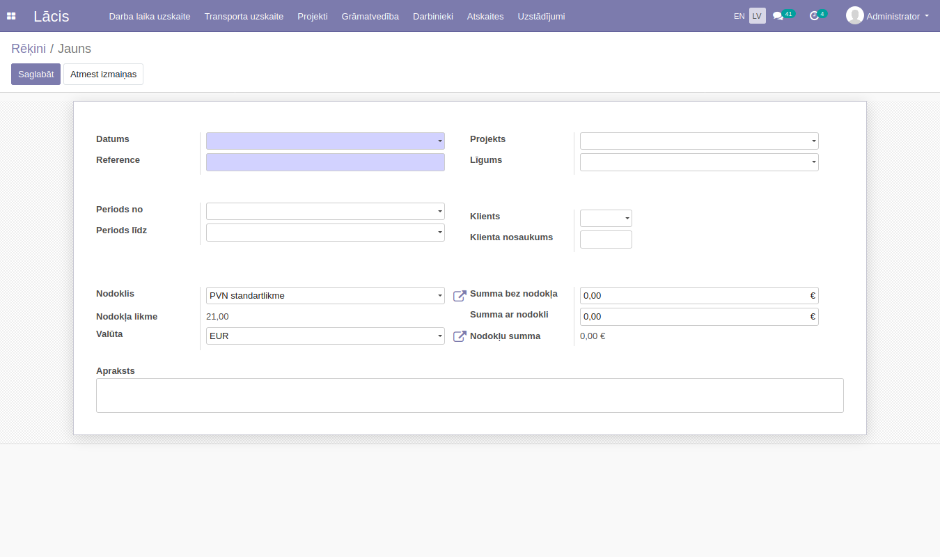 Lai izveidotu jaunu rēķinu, lietotājam nepieciešams aizpildīt laukus: